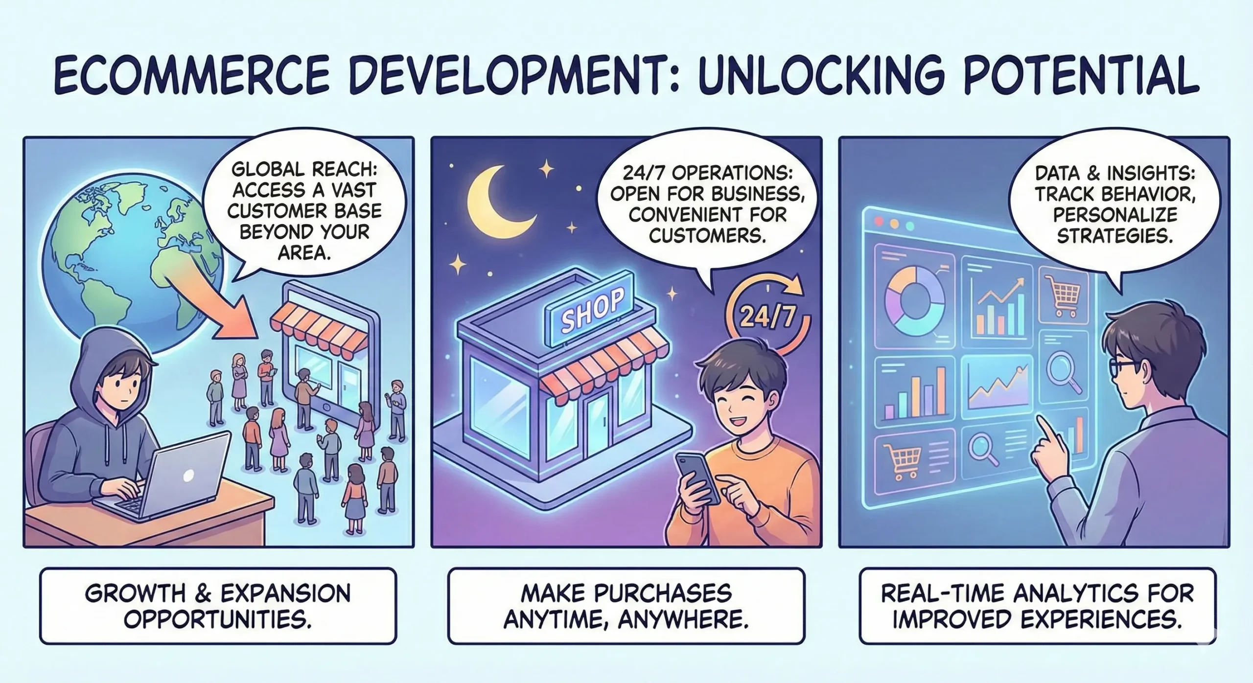 First and foremost, ecommerce development provides businesses with a global reach. You can access a vast customer base beyond your local area with an online store and open up new opportunities for growth and expansion. Additionally, an ecommerce platform enables businesses to operate 24/7, allowing customers to make purchases conveniently.